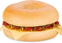 Oven roasted tomatoes effortlessly blend with pesto and mozzarella to create a bagel that’s bursting with flavour.