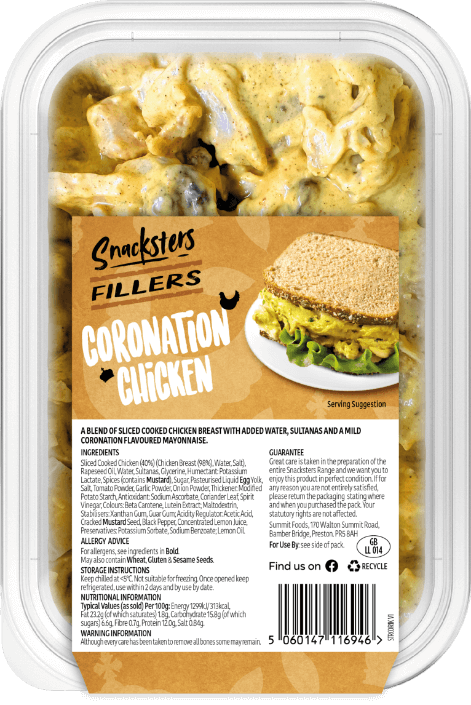 A blend of sliced cooked chicken breast, sultanas and a mild coronation flavoured mayonnaise.