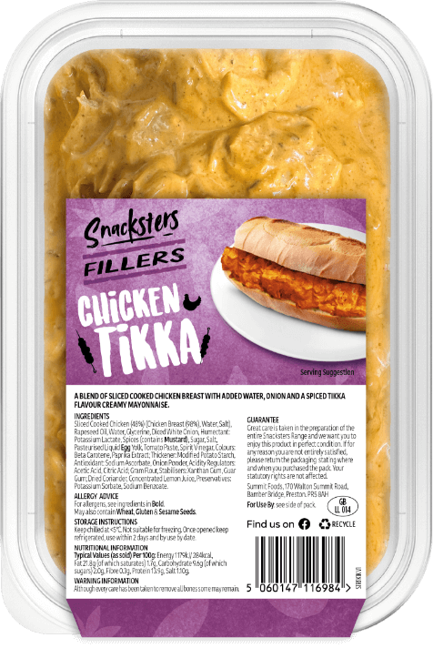 A blend of sliced cooked chicken breast, onion and a spiced tikka flavour creamy mayonnaise.