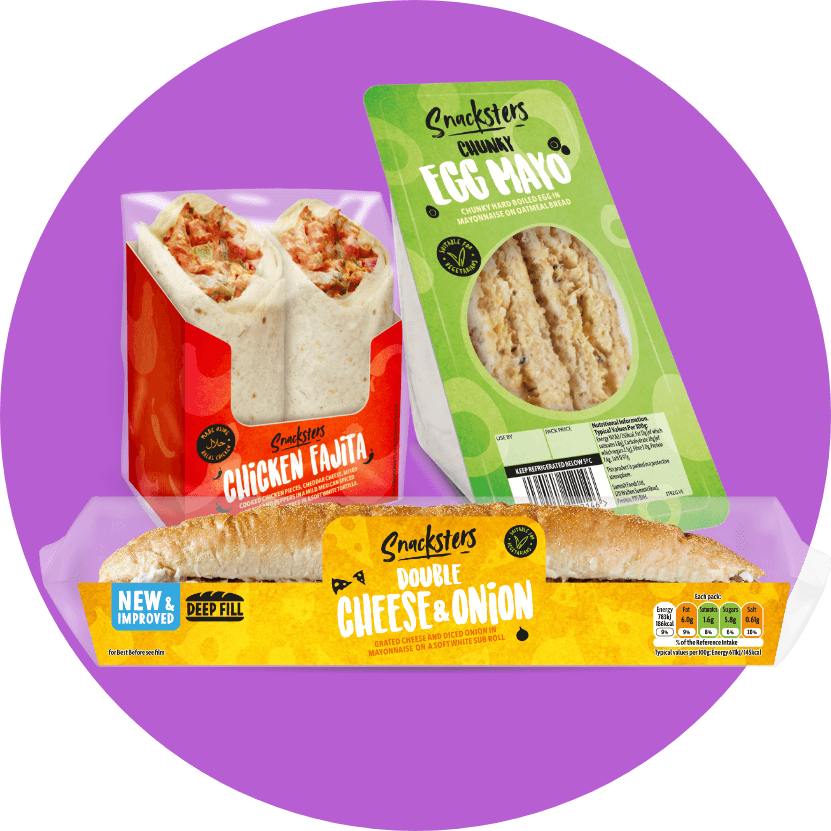 Packed with flavour, you’ll find all your favourites with our range of sandwiches, wraps and subs. Easy to spot with its colourful Snacksters packaging in convenience stores, garage forecourts, on the High Street or anywhere when you are out and about.
